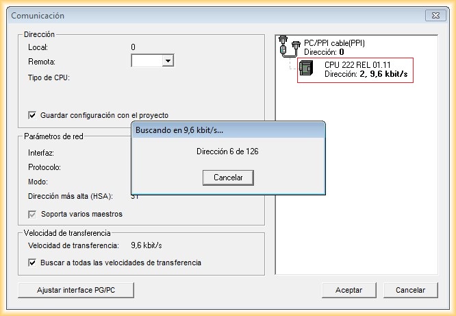 5.- The search for devices will automatically start. If the option to search at all transfer speeds is selected, it will start with the lowest speed and perform a search at all available speeds. Once a CPU is found, we select it and click OK. From this moment, the connection is established, and we can proceed to transfer a project to the CPU or make a copy of the Project to our PC/PG. To provide a more detailed visualization, I will transfer the Project currently running on the CPU to the PC/PG.