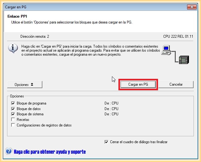 7.- We select Load to PG and the desired options; by default, it appears as shown in the image.