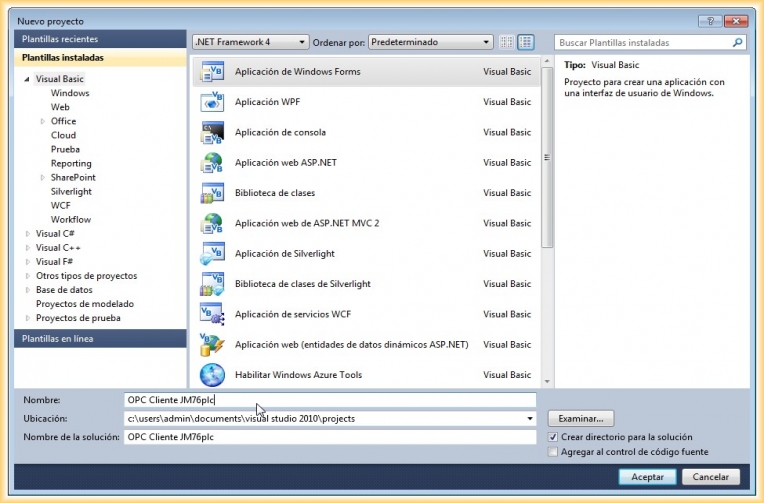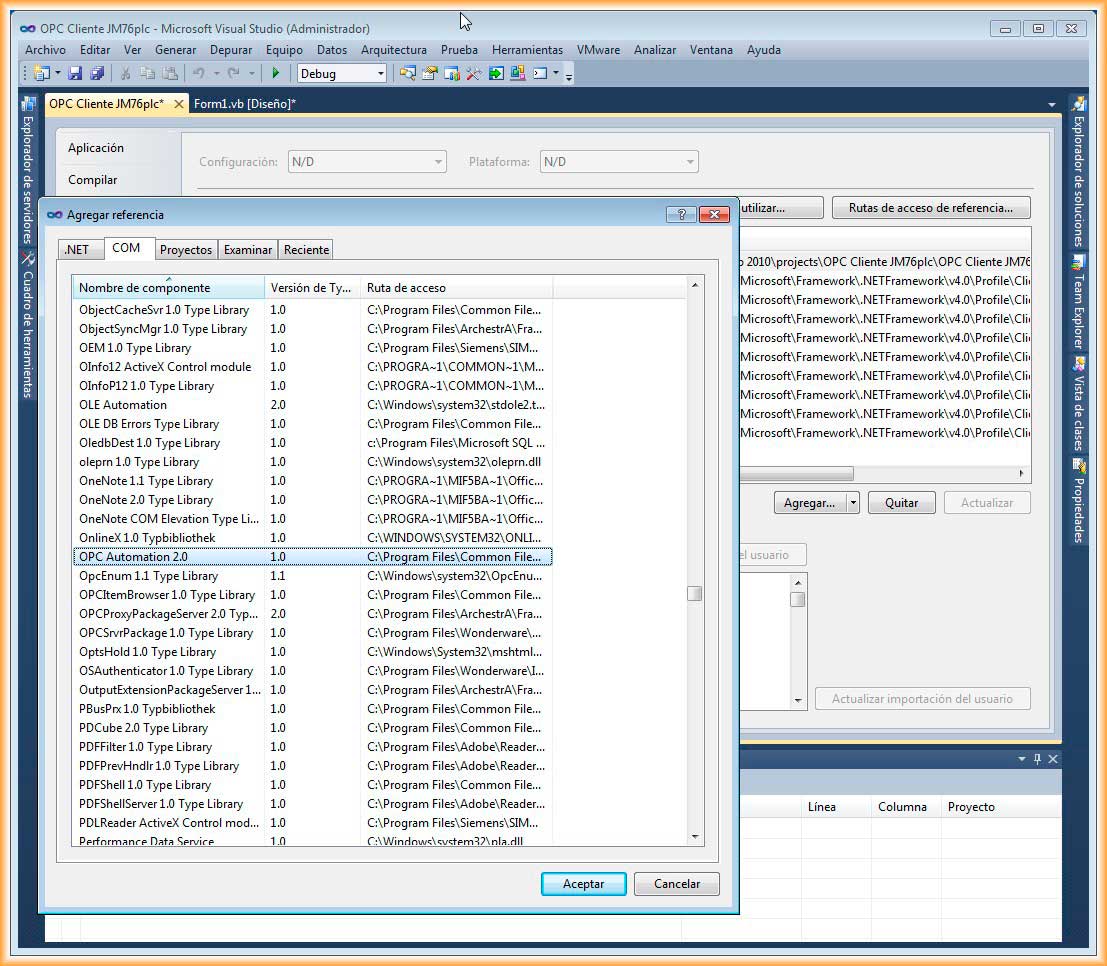 2.- Once we have created our application, we will add the OPC Automation 2.0 reference; for this, we go to: