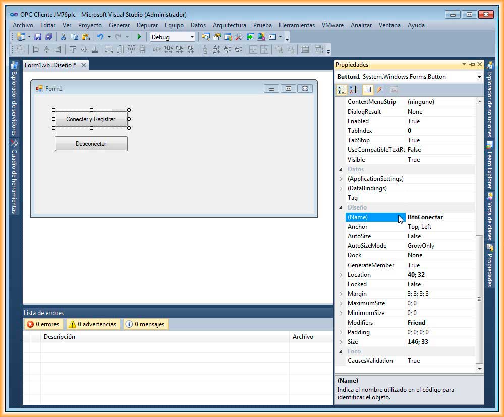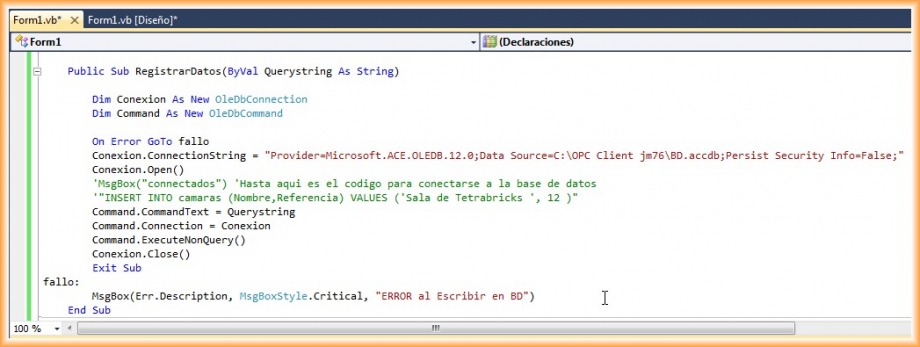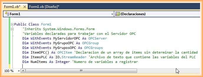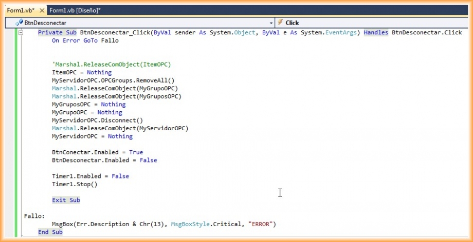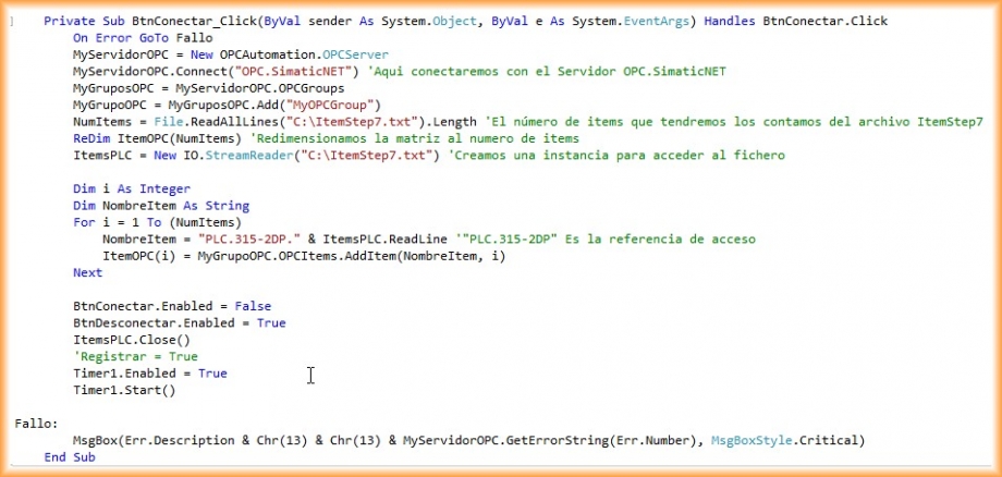 6.- We double-click on our connect button, and this is the code to connect to our Simatic Net OPC Server; if everything goes smoothly, we will activate the Timer1 control, which will help us register the data at the time interval set in its properties