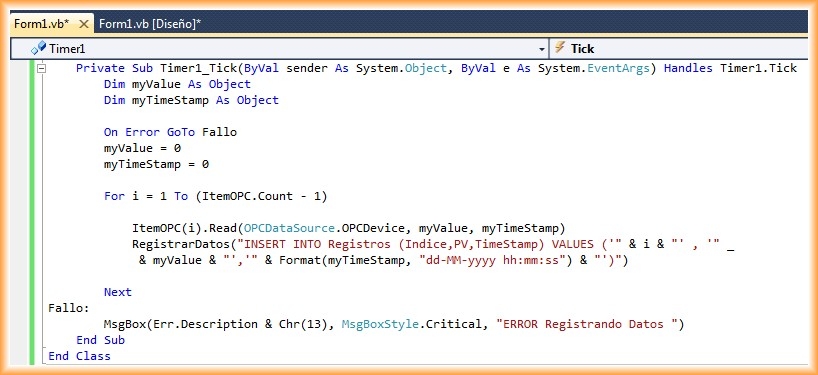 7.- Once connected to the OPC Server, we activate the Timer, and it will execute the code at the established time interval; the code is as follows, and it creates a loop to go through all the items, read their value, and insert them into the database