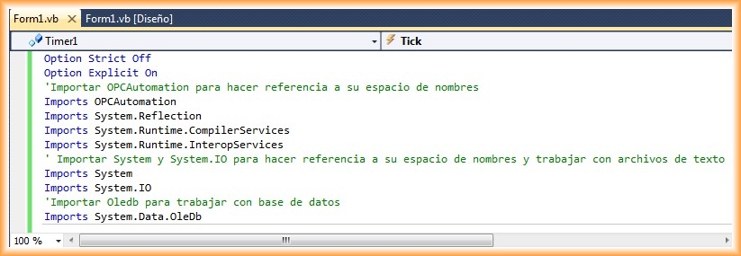 4.- Now we will move on to the programming code; we will work with the namespace related to OPC, with plain text files and Databases, so our first lines of code will be: