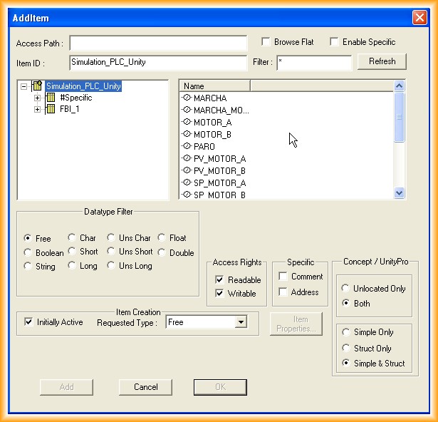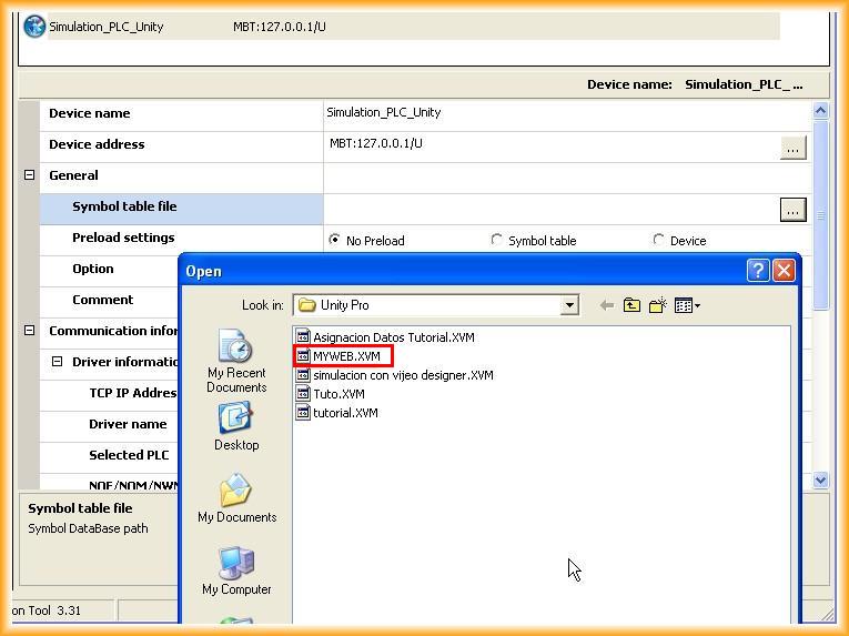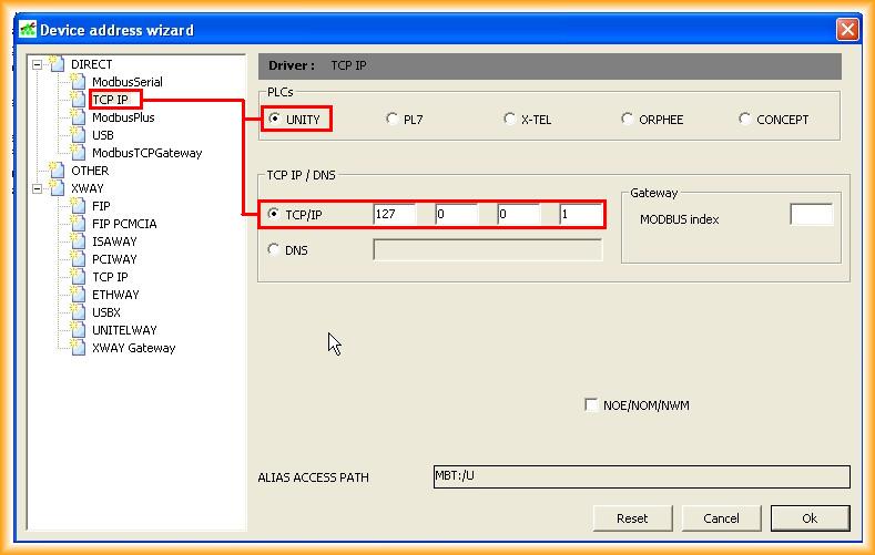 3.- The next step is to configure the equipment we want to access. In our case, we will use the TCP/IP Protocol with a PLC programmed with Unity. We set the IP address of our PLC; we have seen that for simulation purposes, we should select 127.0.0.1 (LocalHost).