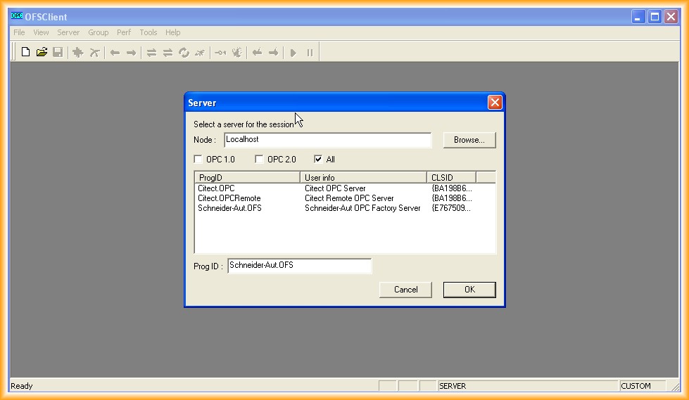 5.- Now we need to test its functionality. For this, there is also an OPC Client available. We create a new project and in Node, specify LocalHost to see the OPC servers, selecting Schneider-Aut.OFS.