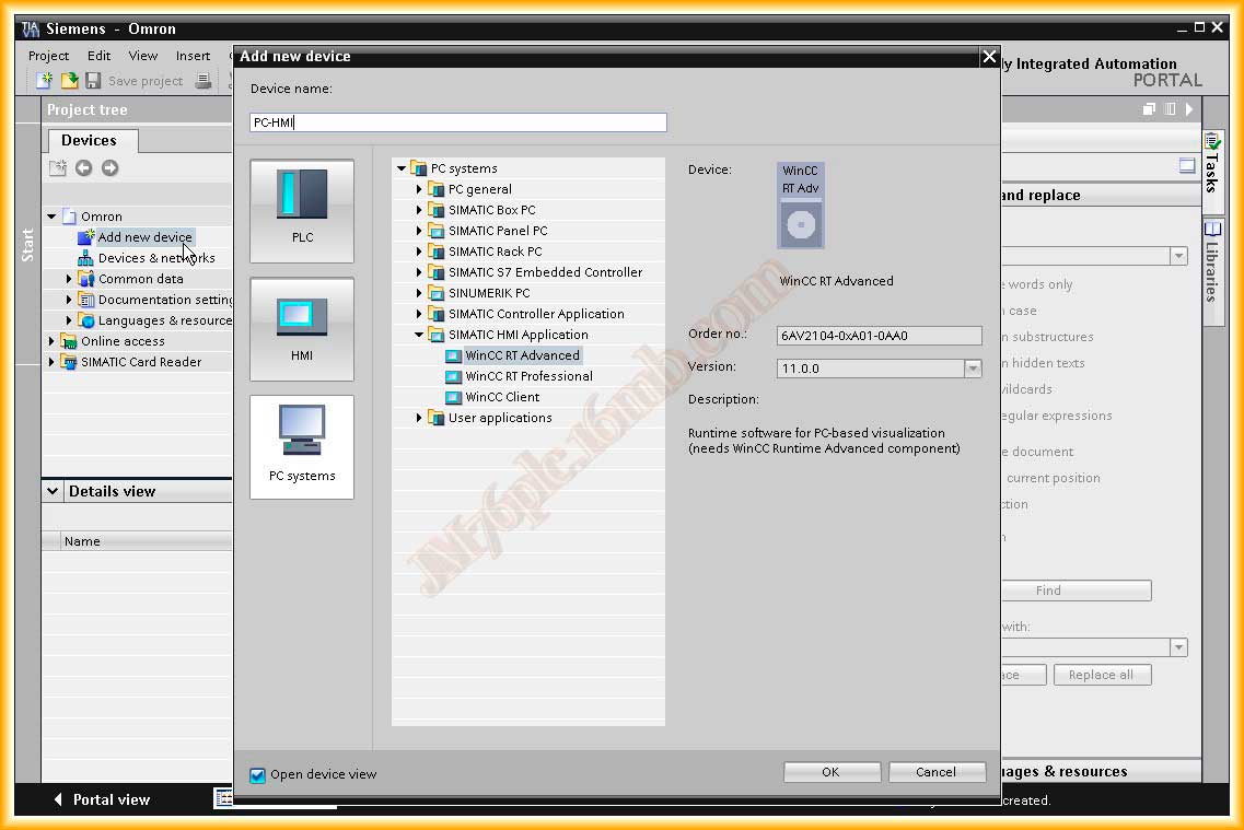 We create a new project in TIA Portal and add a new device, as we mentioned, our case is WinCC RT Advanced.