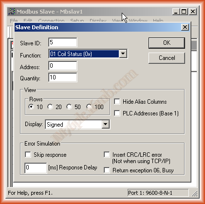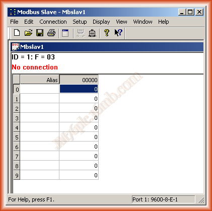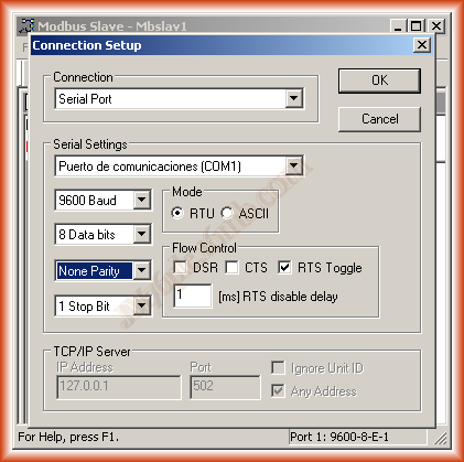 We start the Modbus Slave, and by default, it appears configured for slave number 1 and the register area 4, but the first thing we need to do is configure the connection, for this we go to Connection, and define the parameters.