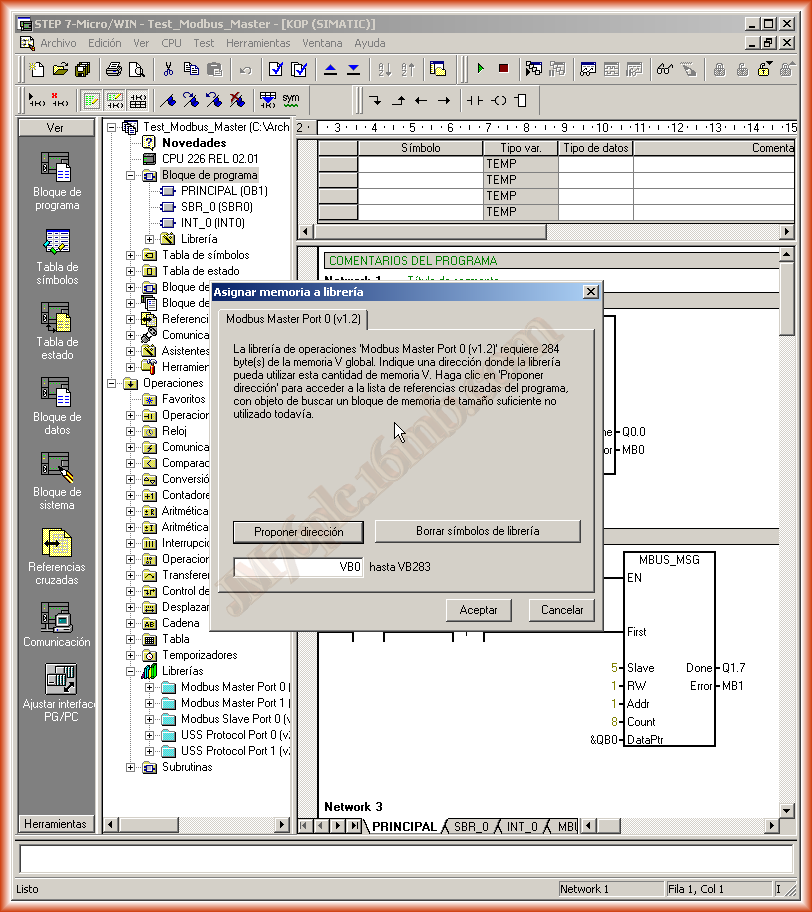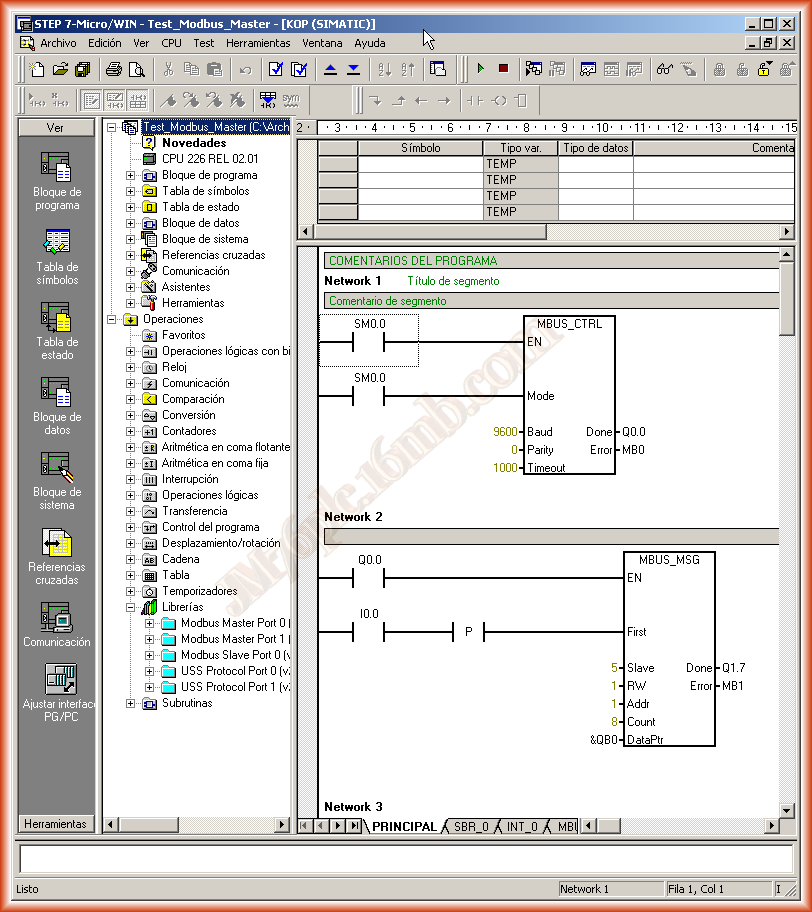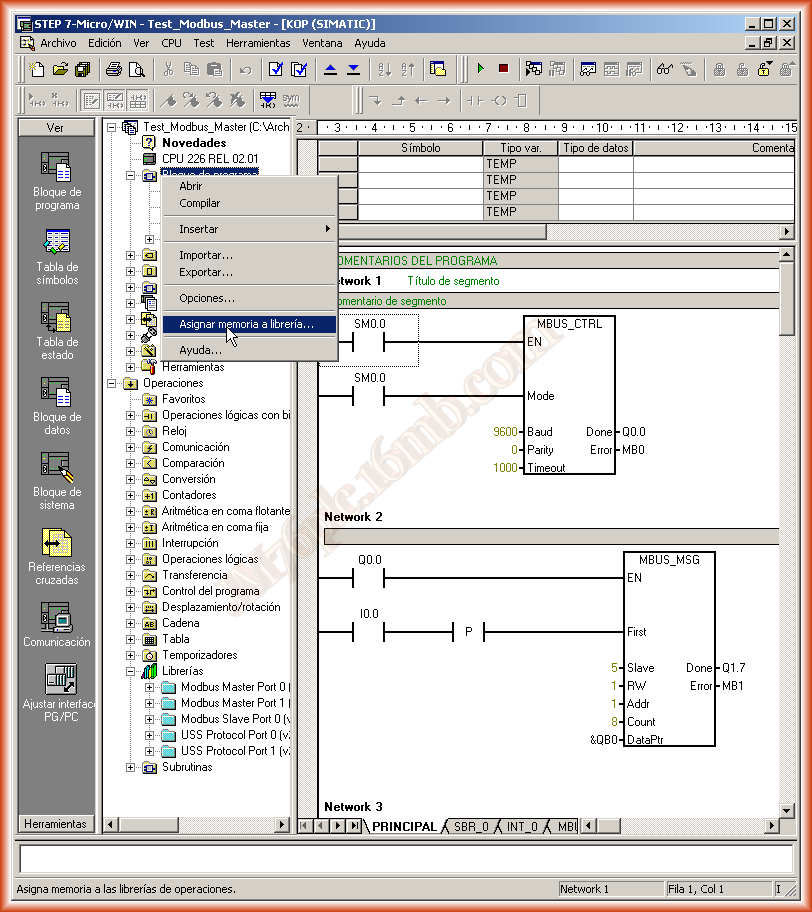 Following the previous practice, today we are going to configure the S7-200 as a Master in a Modbus-RTU network. For this, we will need two more functions from the Modbus library, starting from our project in Microwin and inserting the following functions from the library depending on the port to be used in the CPU.