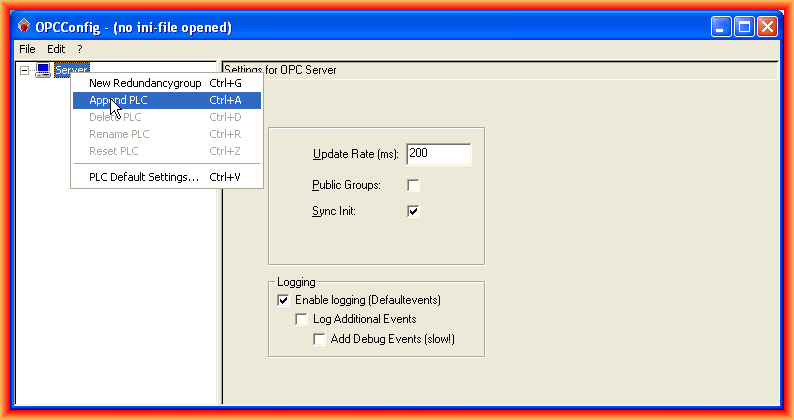 To make the configuration, we run the OPCConfig, and this is the interface; the first thing we do is Add a PLC.