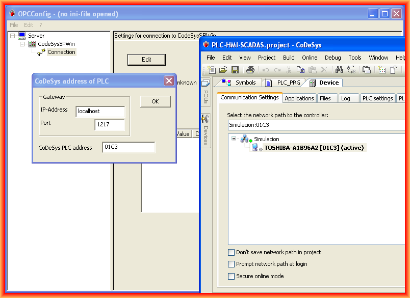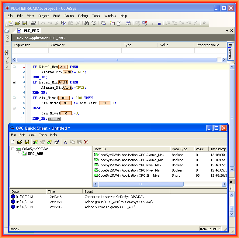 And in the following image, our program is running, and the configuration of the OPC Client to access the Server and check its operation.