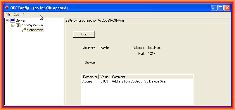 Once the Interface is selected, we go to Connection to configure how the connection with our PLC will be. We click the Edit button, and the following pop-up window appears where we configure the IP, port, and Address. Since our PLC is running on the same machine, we indicate the IP or localhost with the port.