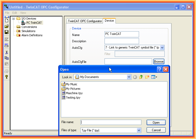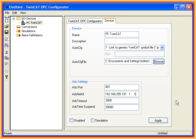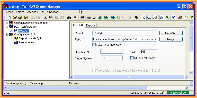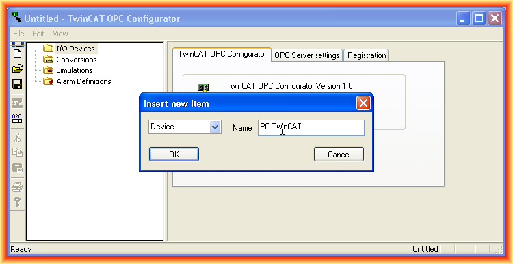 In the following practice, we will see how easy it has been to configure the TwinCAT OPC Server based on the project we created in the previous practice. The first thing we do is run the program that displays the following interface and create a new device in the I/O Device directory, assigning the name we are interested in as we usually do.