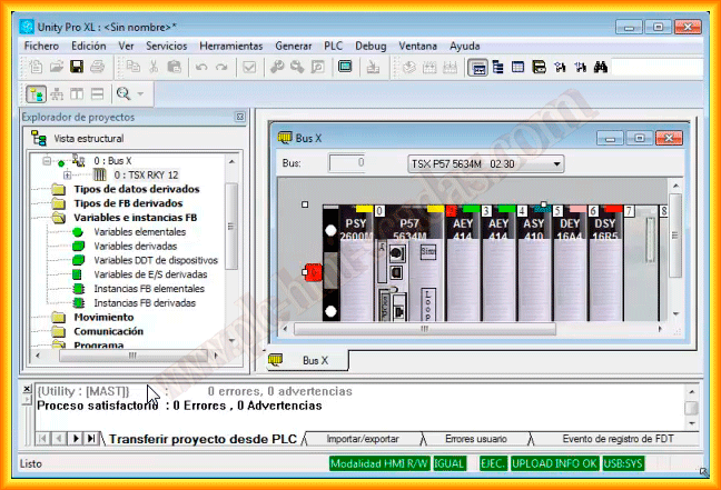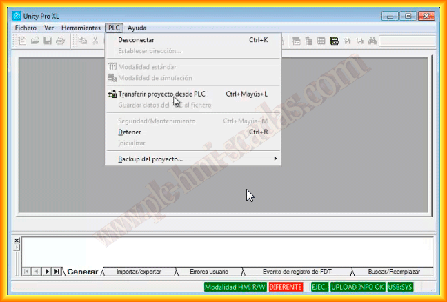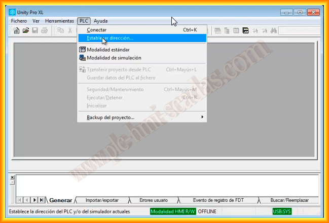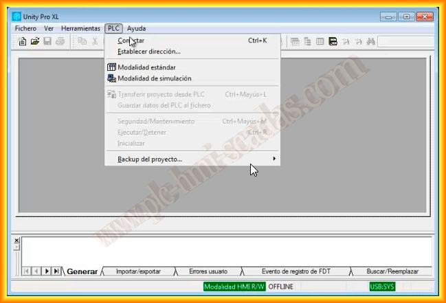 In the following practice, we will create a backup of a project that is loaded on a TSX P57 PLC. The software we will use is Unity Pro, and we will use a USB cable as the interface; we could also use the Ethernet port or the minidim for the same purpose.