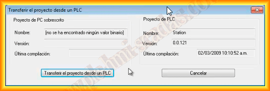 A new pop-up window opens, where we see information about the project and the last compilation that was done. We click on transfer the project from a PLC.