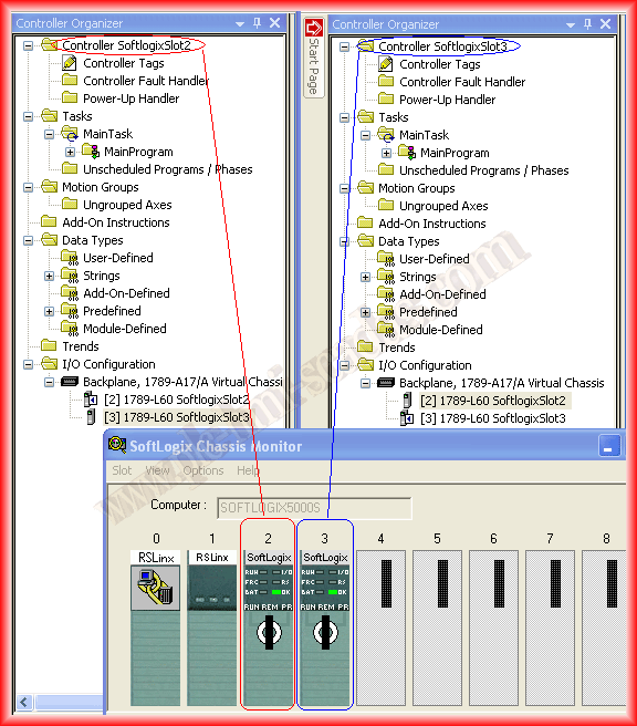 We will base the practice on SoftLogix, for this, the first step is to configure our Rack, we insert two SoftLogix Controllers in Slot 2 and 3 consecutively.