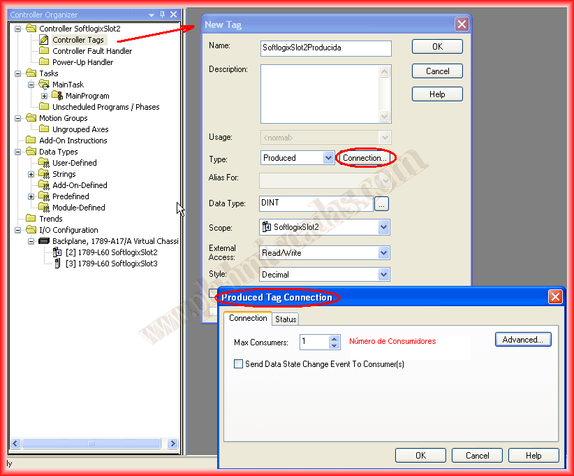 In the same way we created these two tags, we do the same but now the produced tag will be from the SoftlogixSlot3 controller and will be received by the SoftlogixSlot2 controller, and it will look as observed.