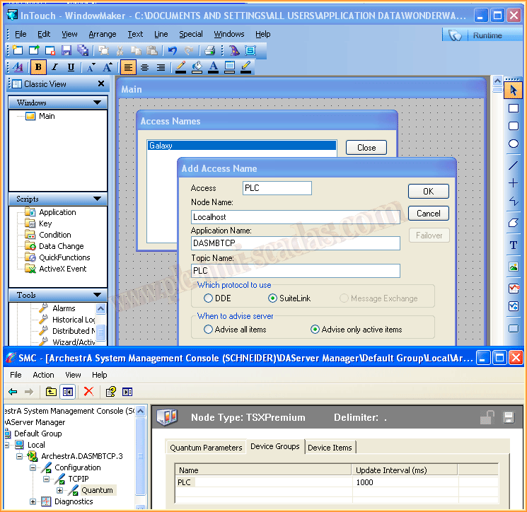 This practice is dedicated to Francisco Amador, and in the following, we will finish configuring Intouch to simulate our PLC program with Intouch. In the previous practice, we have configured the DAServer MBTCP and in this one, we will finalize its configuration. We assume that we have an Intouch application created and we will proceed to configure the AccessName.