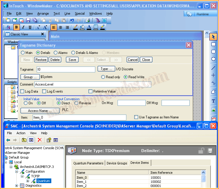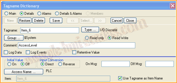 We start the Tagname Dictionary and create new variables according to the items, tags, that we have already configured in the DAServer. We can simply assign the same name as the Item if we select the checkbox Use Tagname as Item Name or we can assign a different name in Intouch as shown in the following example.
