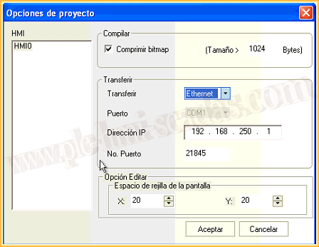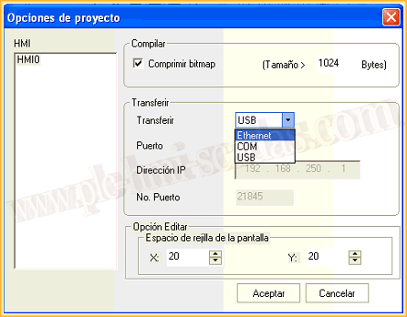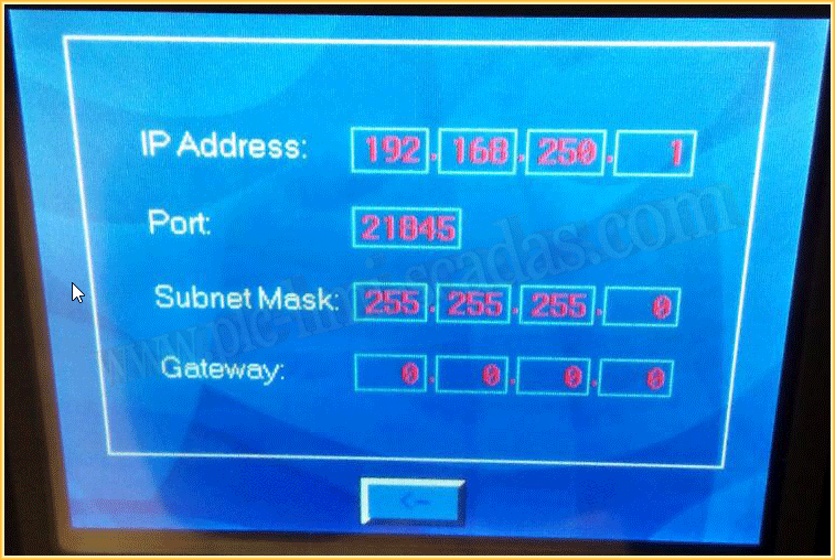 The following pop-up window appears, and we will change from the default, which is USB, to Ethernet and adjust it to the address we configured on our screen as well as the port.