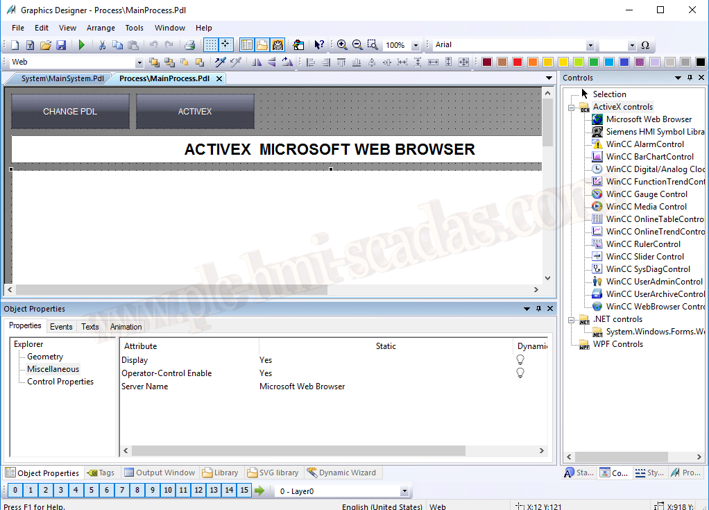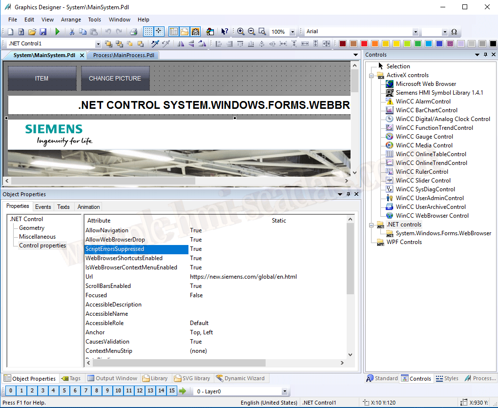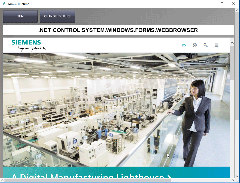 In the ActiveX button, I have defined which web page I want to display, using Siemens' page as an example.