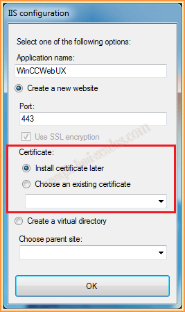 We click Apply configuration, and in the IIS configuration, another pop-up window appears for the configuration of the new Web site, we give or assign the default name, and the port number, by default Https is 443. In the Certificate area, we select Install certificate later. We accept and it will ask for a system restart.