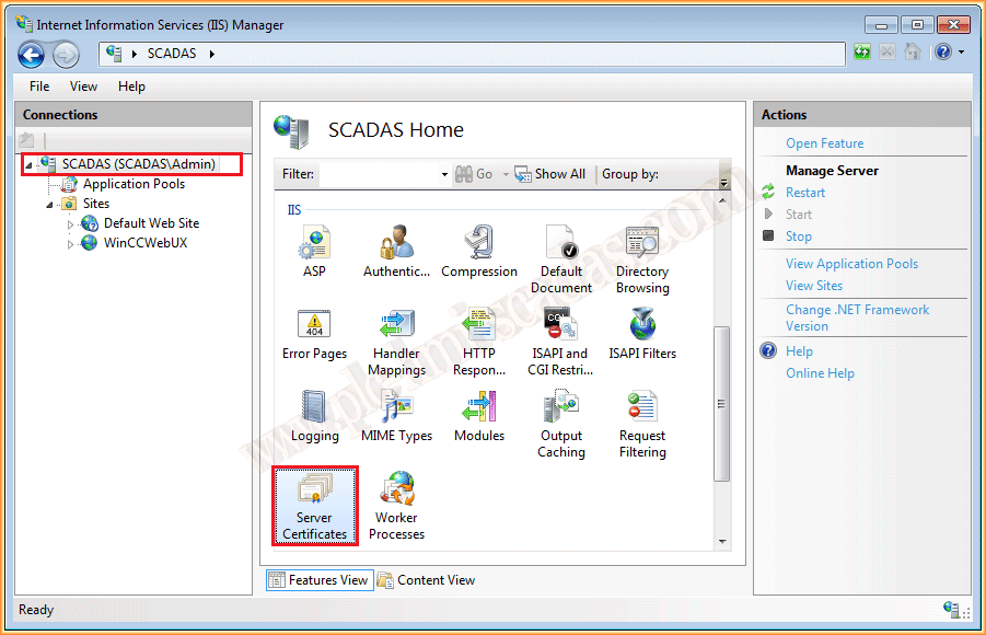 Once restarted, we go to Control Panel / System Tools / Internet Information Services IIE, we will finish the configuration. We click on the name of the PC and within the IIS area, we go to Server Certificates