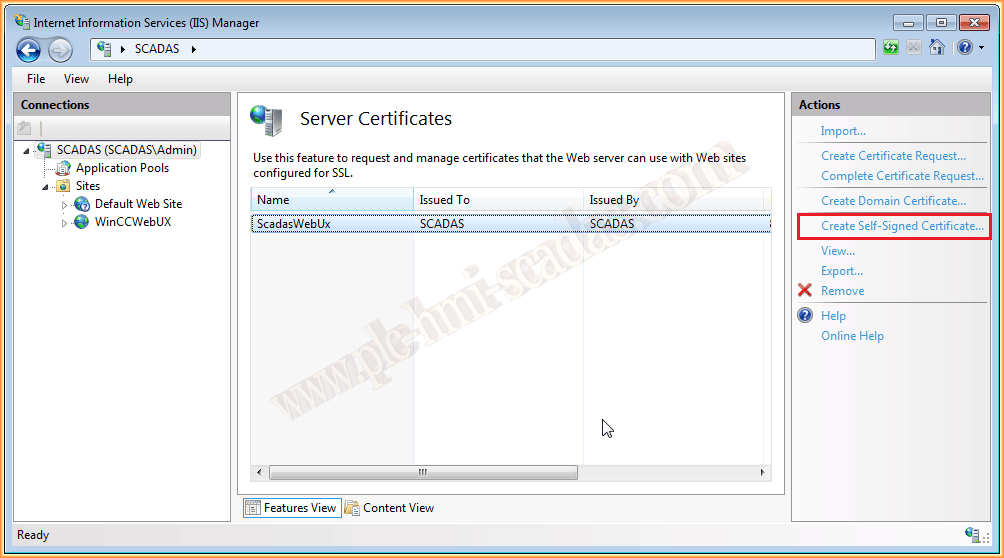 We are going to create a new one, but for that we will use the Create Self-Signed Certificate action, where we assign the name that interests us and follow the wizard for its creation.