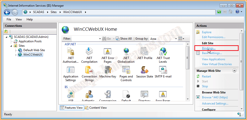 Once the certificate is created, we go to our Web site, and within the actions to Bindings, as shown in the following image.